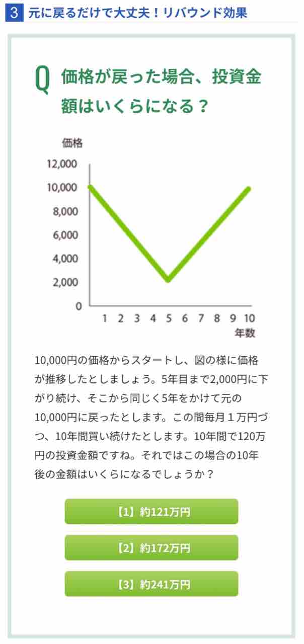 10年間で120万円投資したものが、10年後に価格が半値になっていても利益が出る。つまり、初めに120万円を一度にまとめて投資(一括投資)していた場合、10年後は半分の60万円になるが、積立投資は、ある程度の回復で利益を出せる可能性が高い投資方法になっている。